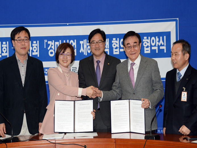 Áö³ 5ÀÏ ¿ì¿ø½Ä ¹ÎÁÖ´ç À»Áö·ÎÀ§¿øÈ¸À§¿øÀåÀ» ºñ·ÔÇÑ À§¿øÈ¸ ÀÇ¿øµé°ú Çö¸í°ü KRAÇѱ¹¸¶»çȸÀåÀÌ °æ¸¶»ê¾÷ ÀçÇØ´ëÃ¥ÇùÀÇȸ Çù¾à½ÄÀ» ü°áÇß´Ù. (»çÁø Á¦°ø ¹ÎÁÖ´ç À»Áö·ÎÀ§¿øÈ¸)