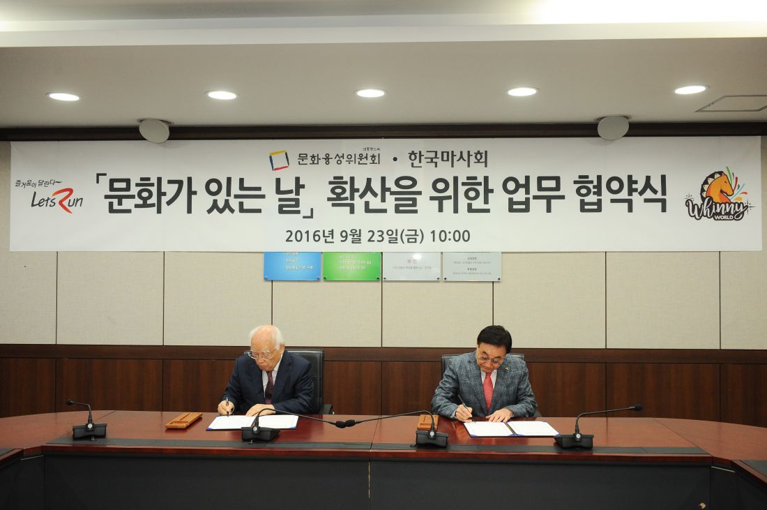 9¿ù 23ÀÏ Çѱ¹¸¶»çȸ ¹®ÈÀ¶¼ºÀ§¿øÈ¸ ¾÷¹«Çù¾à½Ä. ¿ÞÂÊÀÌ Ç¥Àç¼ø À§¿øÀå, ¿À¸¥ÂÊÀÌ Çö¸í°ü Çѱ¹¸¶»çȸÀå.
