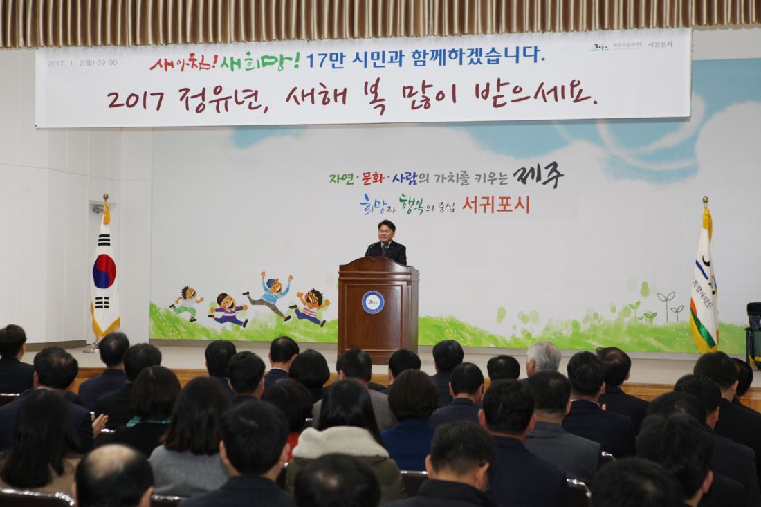 ÀÌÁßȯ ¼±ÍÆ÷½ÃÀåÀÌ 2ÀÏ ¼±ÍÆ÷½Ã Á¦1û»ç ´ëȸÀǽǿ¡¼ ¿¸° 2017³âµµ ¼±ÍÆ÷½Ã ½Ã¹«½Ä¿¡ Âü¼®, ½Å³â»ç¸¦ ³¶µ¶ ÇÑ µÚ 2017³âÀÇ Æ÷ºÎ¸¦ ´ÙÁüÇÏ´Â ±¸È£¸¦ Á¦Ã¢Çϰí ÀÖ´Ù(»çÁø Á¦°ø= ¼±ÍÆ÷½Ãû).