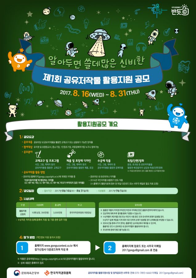 ¡ã¹®ÈüÀ°°ü±¤ºÎ¿Í Çѱ¹ÀúÀÛ±ÇÀ§¿øÈ¸´Â ¡®Á¦9ȸ °øÀ¯ÀúÀÛ¹° âÀÛ°ø¸ðÀü¡¯°ú ¡®Á¦1ȸ °øÀ¯ÀúÀÛ¹° Ȱ¿ëÁö¿ø»ç¾÷¡¯À» °³ÃÖÇÑ´Ù(ÀÚ·á Á¦°ø= Çѱ¹ÀúÀÛ±ÇÀ§¿øÈ¸).
