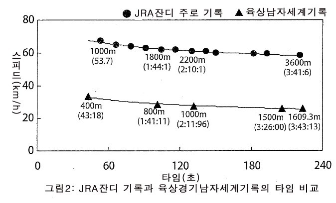 ±×·³ °æ±â ŸÀÓÀÌ °°Àº °æ±â´Â ¹«¾ùÀϱî. ±×°ÍÀº ±×¸² 2¿¡ ÀÖ´Â ´ë·Î, À°»ó¿¡¼´Â Á߰Ÿ® Á¾¸ñÀÌ ÀÌ¿¡ ÇØ´çÇÑ´Ù. À°»ó 800m ¼¼°è ±â·Ï(1ºÐ 41ÃÊ 10)Àº °æ¸¶ 1800m ±â·Ï ŸÀÓ(1:44.1)¿¡ °¡±î¿ì¸ç, À°»ó 1000mÀÇ ½Ã°£(2ºÐ 11ÃÊ 96)Àº °æ¸¶ÀÇ 2200m °æÁÖ¿¡ °¡±õ´Ù. JRA ÆòÁö °æÁÖ¿¡¼ °¡Àå Àå°Å¸®ÀÎ 3600mÀÇ Å¸ÀÓÀº À°»ó 1¸¶ÀÏ ´Þ¸®±â(1609.3m)ÀÇ ¼¼°è ±â·Ï(3ºÐ 43ÃÊ 13)°ú °ÅÀÇ µ¿ÀÏÇÏ´Ù. À°»ó 400m Á¾¸ñ ¼¼°è ±â·Ï(43ÃÊ 18)À» º¸¸é, °æ¸¶ 1000m(±â·Ï 0:53:7)°æÁÖ¿¡ ÇØ´çÇÏ´Â À°»ó Á¾¸ñÀº 500m °æ±â Á¤µµ´Ù. À°»ó¿¡ 500m ´Þ¸®±â´Â ¾øÁö¸¸ ¸»ÀÌ´Ù.