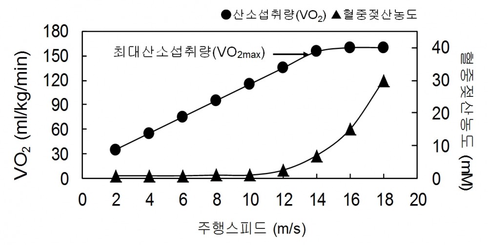 ±×¸²1] ¿îµ¿¿¡ ¼Ò¿äµÇ´Â »ê¼Ò ¼·Ãë·®(VO2)°ú Ç÷ÁßÁ¥»ê³óµµÀÇ º¯È: ÁÖÇེÇǵ尡 »¡¶óÁö´Â °ÍÀ» ºñ±³ÇÏ¿© »ê¼Ò¼·Ãë·®Àº Áõ°¡Çϰí ÀÖÀ¸¸ç °ð ¼öÆòÀ» À¯ÁöÇÏ°Ô µÈ´Ù. ÀÌ Á¡À» ÃÖ´ë»ê¼Ò¼·Ãë·®(VO©ümax)À̶ó ÇÑ´Ù. ÀÌ ±×·¡ÇÁ¿¡¼´Â ¾à 160m/kg/minÀÌ´Ù.