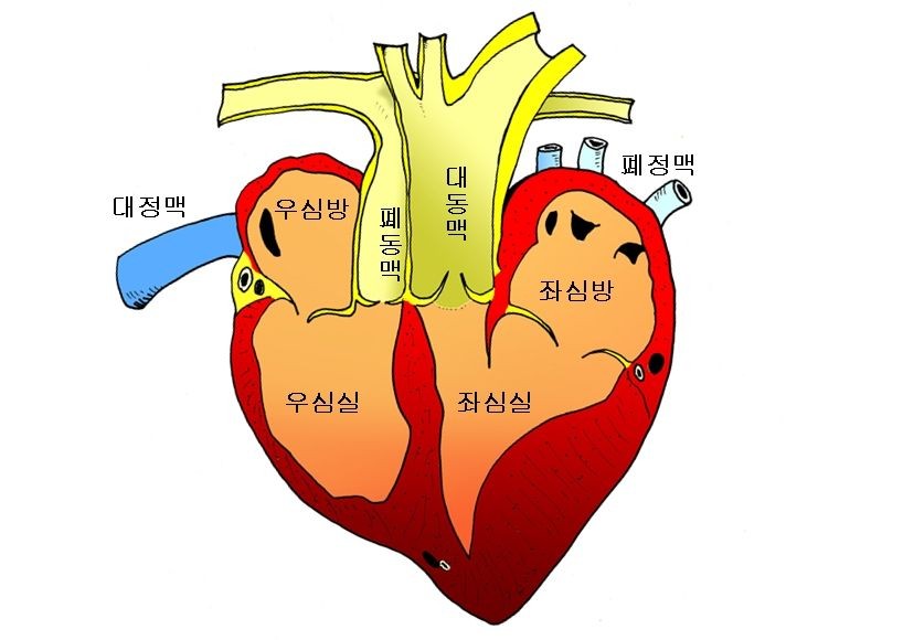 [±×¸² 1] ½ÉÀåÀÇ ³»ºÎ ±¸Á¶: ½ÉÀåÀº ÁÂ¿ì ½É¹æ, ÁÂ¿ì ½É½Ç, ÇÕ°è 4°³ÀÇ ¹æÀ¸·Î ±¸¼ºµÇ¾îÀÖ´Ù. Ç÷¾×Àº Á½ɽǿ¡¼ ´ëµ¿¸ÆÀ» ÅëÇØ Àü½ÅÀ¸·Î º¸³»Áö°í, ´ëÁ¤¸Æ¿¡¼ ¿ì½É¹æÀ¸·Î µ¹¾Æ¿Â´Ù. ¿ì½É¹æÀ¸·Î µ¹¾Æ¿Â Ç÷¾×Àº Æóµ¿¸ÆÀ» ÅëÇØ¼ Æó·Î º¸³»°í °¡½º ±³È¯ÀÌ ÀÌ·ç¾îÁø´Ù(»ê¼Ò ÈíÀÔ°ú ÀÌ»êÈź¼Ò ¹èÃâ). °¡½º ±³È¯ÀÌ ÀÌ·ïÁø Ç÷¾×Àº ÆóÁ¤¸Æ¿¡¼ Á½ɹ濡 µé¾î¿Â µÚ ´Ù½Ã Á½ɽǿ¡¼ ¿Â¸ö¿¡ º¸³½´Ù.
