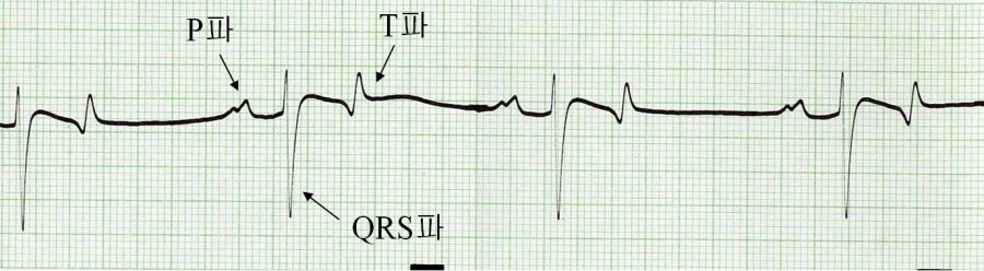 [±×¸² 2] ¸»ÀÇ ½ÉÀüµµ: ½É¹æÀÌ ¸ÕÀú ÈïºÐ¡¤¼öÃàÇÏÁö¸¸ À̸¦ ½ÉÀüµµ·Î º¸¸é PÆÄ·Î½á °üÂûµÈ´Ù. ³ªÁß¿¡ °üÂûµÇ´Â ÀÏ·ÃÀÇ QRSÆÄ¿Í TÆÄ°¡ ½É½ÇÀÇ È°µ¿À» º¸À̰í ÀÖ´Ù.