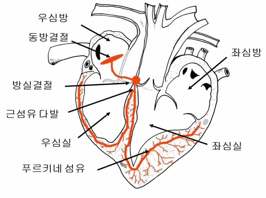 [±×¸² 1] ¿ì½É¹æ¿¡ À§Ä¡ÇÑ ¡®µ¿¹æ°áÀý¡¯·Î ºÒ¸®´Â ºÎÀ§°¡ ÀÏÁ¤ÇÑ ºóµµ·Î ÀÚµ¿ÀûÀ¸·Î ÈïºÐÇÑ´Ù. ±× Àü±âÀû ÈïºÐÀº ÁÖÀ§ÀÇ ½É¹æ±Ù¿¡ ÀüÇØÁö¸é¼ ½É¹æ±Ù Àüü¸¦ ÈïºÐ½ÃŰ´Â µ¿½Ã¿¡, ½É¹æ ³»¿¡ ÀüÇØÁ®, ¹æ½Ç°áÀý¿¡ À̸¥´Ù. ÈïºÐÀº ÀÌ¾î ±Ù¼¶À¯ ´Ù¹ßÀ» Åë°úÇÏ°í ¿À¸¥ÂÊ ´Ù¸®, ¿ÞÂÊ ´Ù¸®¸¦ °æÀ¯ÇØ ½É½Ç±Ù¿¡ ºÐÆ÷ÇÏ´Â ¡®Çª¸£Å°³× ¼¶À¯¡¯¿¡ À̸¥´Ù.