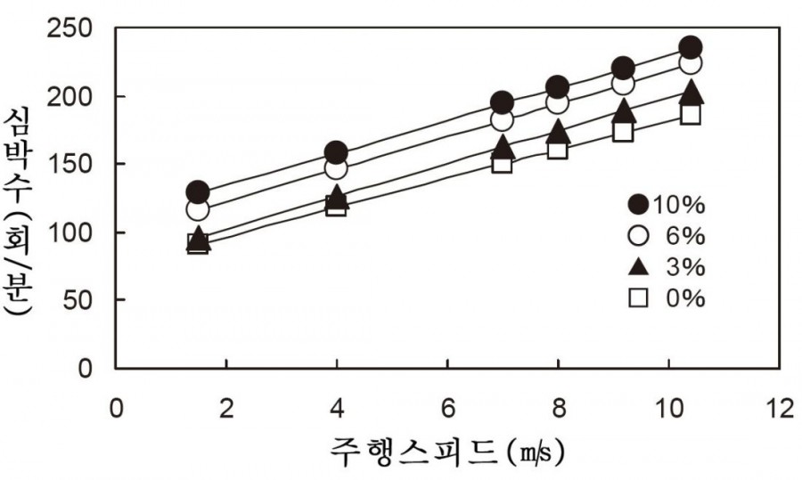 ±×¸² 1Àº ´ç½ÃÀÇ ½É¹Ú¼ö ±â·ÏÀÌ´Ù. ½É¹Ú¼ö´Â ÁÖÇà ½ºÇǵ尡 »¡¶óÁü¿¡ ºñ·ÊÇØ Áõ°¡Çϰí ÀÖ´Ù. 0%¿¡¼ 10%±îÁö, ¾î´À °æ»çµµ¿¡¼µµ ¼Óµµ°¡ »¡¶óÁú¼ö·Ï ±×¿¡ ºñ·ÊÇØ »ó½Â¼¼¸¦ ¶ì¸ç ½É¹Ú¼ö°¡ ¼±ÇüÀûÀ¸·Î Áõ°¡ÇÑ´Ù. ÇÑÆí, °æ»çµµ°¡ 0%¿¡¼ 10%·Î Áõ°¡Çϸé ÀÌ¿¡ µû¶ó ½ÉÀå ¹Úµ¿µµ Áõ°¡ÇÑ´Ù.