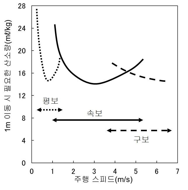 [±×¸² 1] ¸»ÀÌ 1m À̵¿ÇÒ ¶§ ÇÊ¿äÇÑ ÄÚ½ºÆ®¸¦ »ê¼Ò·®À¸·Î Ç¥½ÃÇß´Ù(üÁß 1kg´ç). ¼Óº¸¿Í ±¸º¸ ¾ç¹æÀÇ º¸¹ýÀ¸·Î ÁÖÇàÇÑ 3.6m~5.2§½ÀÇ ½ºÇÇµå ¹üÀ§ ³» ÄÚ½ºÆ®¸¦ º¸¸é, 4.6§½º¸´Ù ´À¸° ½ºÇǵåÀÎ ±¸º¸ÀÇ ÄÚ½ºÆ®´Â ¼Óº¸ÀÇ ÄÚ½ºÆ®º¸´Ù ³ô¾Ò´Ù. ÇÑÆí, 4.6§½º¸´Ù ºü¸¥ ½ºÇǵåÀÎ ±¸º¸ÀÇ ÄÚ½ºÆ®°¡ ¼Óº¸ÀÇ ÄÚ½ºÆ®º¸´Ù ³·¾Ò´Ù. (Hoyt&Taylor, 1991³â ¹Ì±¹ °úÇÐÀâÁö <³×ÀÌó>¿¡ ½Ç¸° ³í¹®À» Âü°íÇØ ÇÊÀÚ°¡ ±×¸².)