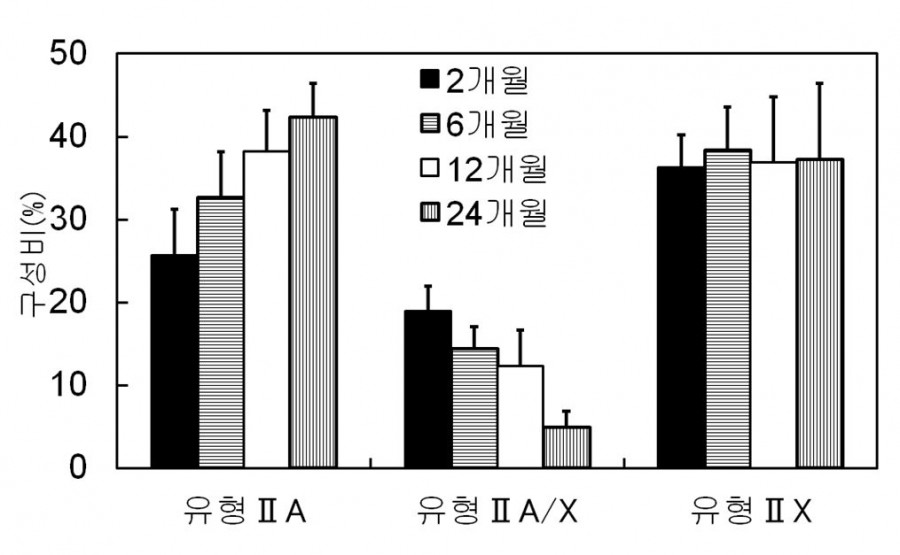 [±×¸² 1] »ýÈÄ 2°³¿ùºÎÅÍ 24°³¿ù±îÁöÀÇ ¼ºÀå¿¡ µû¸¥ ±Ù¼¶À¯ ºÐ·ùÀÇ º¯È. ¼ºÀå¿¡ µû¶ó À¯Çü ¥±A/XÀÇ ÇÏÀ̺긮µå ¼¶À¯ÀÇ ºñÀ²Àº °¨¼ÒÇÏ´Â ÇÑÆí, À¯Çü ¥±A ¼¶À¯ÀÇ ±¸¼ºÀº Áõ°¡ÇÑ´Ù. À¯Çü ¥±X ¼¶À¯ÀÇ ºñÀ²Àº °ÅÀÇ º¯ÈÇÏÁö ¾Ê´Â´Ù. (Yamano, Am. J. Vet. Res. ÀÇ µ¥ÀÌÅ͸¦ ÇÊÀÚ°¡ ±×¸²)