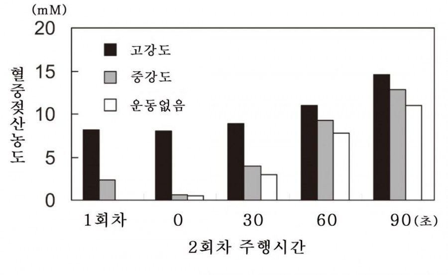 °á°ú¸¦ º¸ÀÚ. ¿ì¼± 1ȸÂ÷ ¿îµ¿À» ÇÔÀ¸·Î½á Ç÷Áß Á¥»ê ³óµµ´Â ¨çÀÇ ³ôÀº °µµ¿¡¼ ¿îµ¿ÇÑ ÈÄ ¾à 8mMÀ¸·Î, 10ºÐ°£ Æòº¸¸¦ ÇÑ ÈÄ 2ȸÂ÷¿¡¼´Â ¿îµ¿ Á÷Àü °ÅÀÇ °°Àº °ªÀ» À¯ÁöÇϰí ÀÖ¾ú´Ù. ¨èÀÇ Áß°£ °µµ °æ¿ì´Â 1ȸÂ÷ ¿îµ¿¿¡ µû¶ó 2mM Á¤µµ¹Û¿¡ Áõ°¡ÇÏÁö ¾Ê°í, 2ȸÂ÷ Á÷Àü¿¡ °ÅÀÇ ¾ÈÁ¤ ¼öÁرîÁö µ¹¾Æ¿Ô´Ù(±×¸² 1).