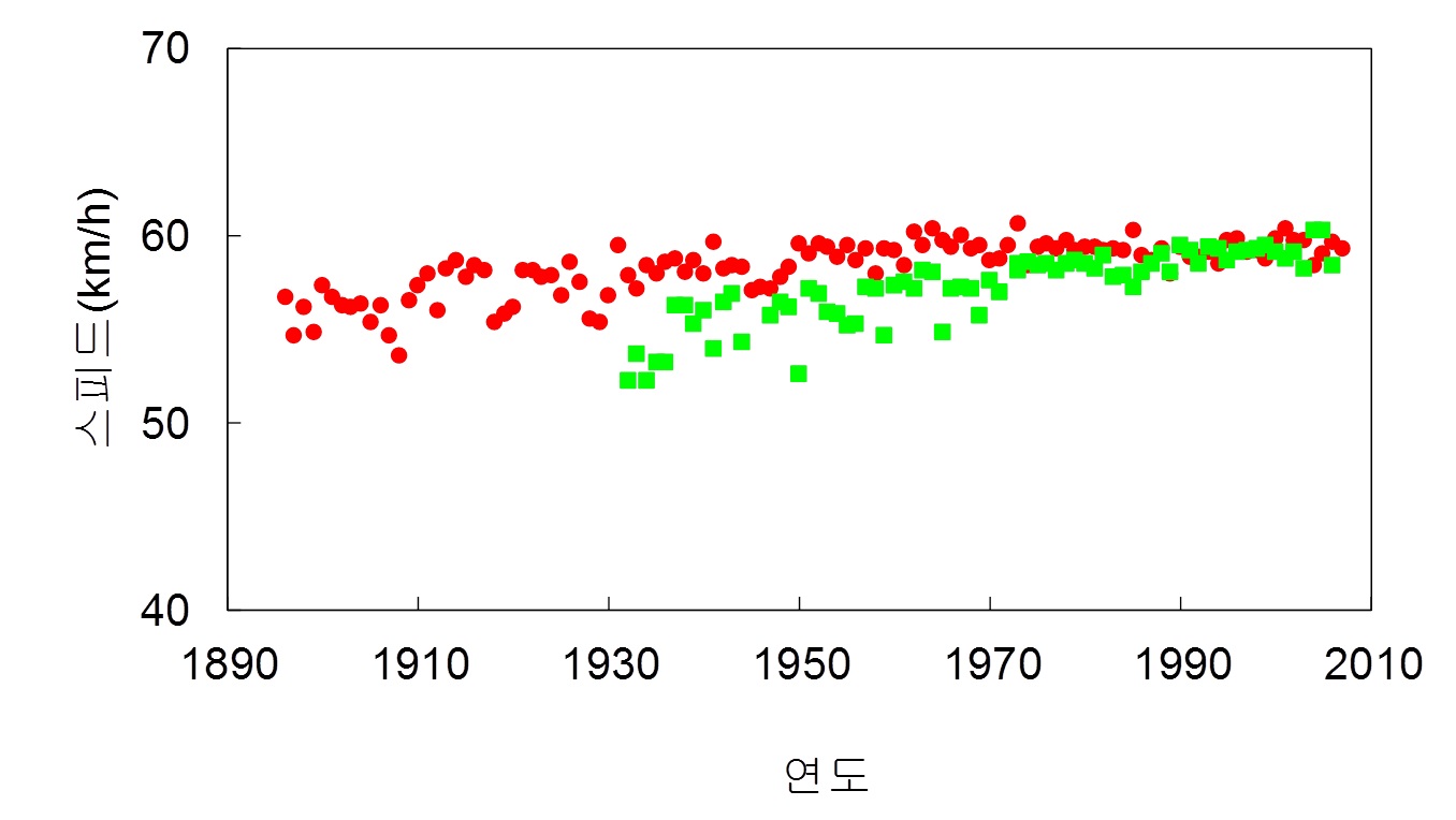 ÄËÅÍŰ ´õºñ¿Í ÀϺ» ´õºñÀÇ ½ºÇÇµå º¯ÃµÀ» ³ªÅ¸³½ Ç¥. »¡°£ µ¿±×¶ó¹Ì°¡ ÄËÅÍŰ ´õºñ ±â·Ï, ÃÊ·Ï ³×¸ð°¡ ÀϺ» ´õºñ ±â·Ï.